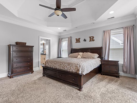 The spacious main-level master suite is a private retreat, featuring a cozy sitting area, a spa-like bath with a jetted tub and separate tiled shower, and an oversized walk-in closet. Two additional bedrooms and two full bathrooms complete the main level, offering flexibility for family and guests. Upstairs, a generous fourth bedroom doubles as a bonus space-ideal for a home office, media room, or gym.