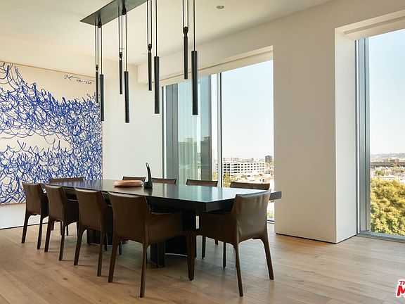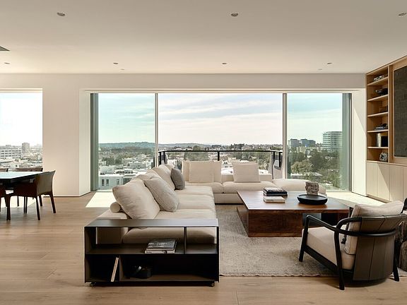 Residence 8D is a jewel within the 8899 BeverlyTower Residences. Named "The Architect's Suite", 8D features multiple custom finishes and furnishings curated by Olson Kundig specifically for this 3-bedroom floor plan including gorgeous custom oak shelving and a large entertainment center in the great room that perfectly complements the warmth of the open gathering space. Framed by breathtaking views, the dining room is punctuated by a dramatic PerfPulley Chandelier from the Olson Kundig Collection. This floorplan includes a separate office area providing private refuge with three private bedrooms tucked away from the central entertaining areas. The generous primary suite offers a private terrace, dual walk-in closets, and a floating soaking tub facing the glass. The sliding glass doors to the two terraces are a Swiss-made, Vitrocsa glass system. The finest, hand-selected, materials include travertine throughout the residences and common areas, Sub-Zero, Miele and Gaggenau appliances, Calacatta Gold marble, bronze residence entry surrounds, and custom door handles crafted with bronze and hand-stitched leather. The listed price includes the Olson-Kundig curated furnishings (all contents excluding wall art). 8899 Beverly Blvd is Olson Kundig's "Love Letter to Los Angeles". This architectural gem offers exceptional amenities and full-service living with 24-hour concierge, 24-hour valet parking, and a fitness center with a private studio. Outside, a lushly landscaped quarter-acre oasis awaits with a resort-style pool, spa, fireplaces, and custom outdoor kitchen. Walk to premier dining and shopping destinations, grocery stores, and the best West Hollywood has to offer including the new Stella Restaurant located in the building. Experience the epitome of luxury living in West Hollywood. Contact us for a private viewing today.