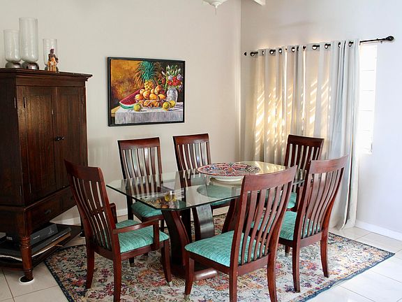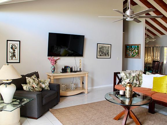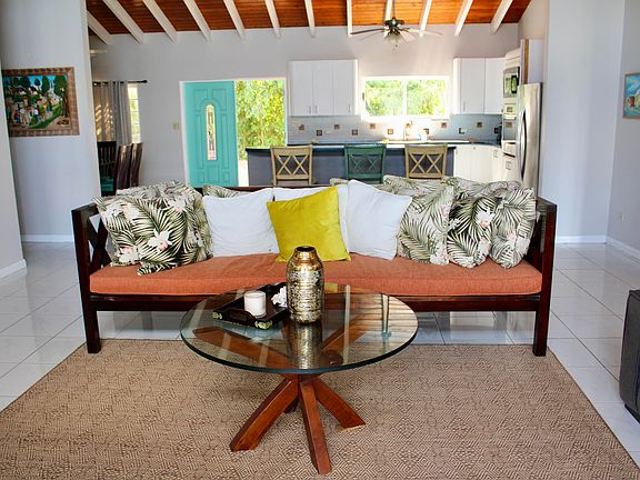 Beautifully decorated 3/2 home in La Grande Princesse is an island oasis. The large primary suite features a walk-in closet, en suite with dual sinks and a split AC. Relax on the comfortable sofas in the spacious living room and watch movies or your favorite game on the large flat screen TV. Entertaining is easy thanks to the modern kitchen with stainless steel appliances and an island with seating. Two additional bedrooms, both w/ AC, and bathroom complete this lovely home. Sip morning coffee under the pergola and stargaze on the gallery that extends the length of the house and offers a peek-a-boo sea view. Conveniently located 5 minutes from Christiansted, & Sunny Isle and close to beaches, grocery stores, restaurants & other amenities. Internet, wifi, yard, pest & garbage included.