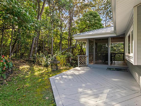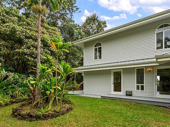 The home is surrounded by mature landscaping and an ohia forested area beyond. 15,000 gal. water catchment tank and garden shed is tucked away in the trees.