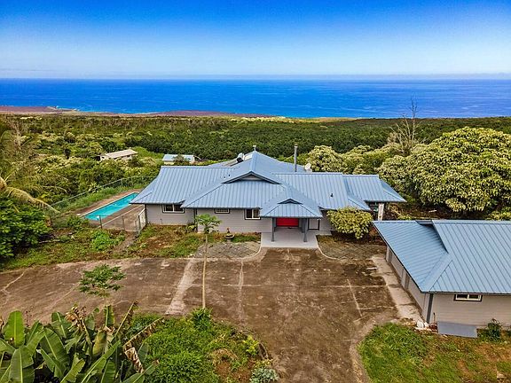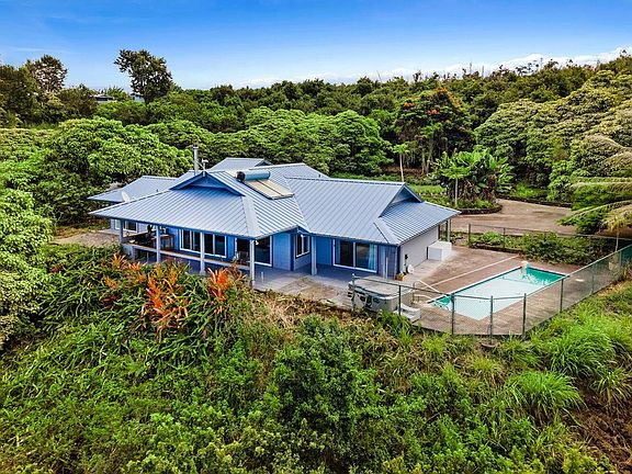 This large custom three bedroom two bath ranch home with vaulted ceilings and fireplace consists of 28 acres of farmland with good soil and features a variety of lemons, bananas, oranges, dragon fruit, coffee, avocados, cashew, papaya, coconut, tangelo, bamboo, milo, neem, fig, Surinam cherry, jaboticaba, kakui nuts, milo and native Hawaiian plants.