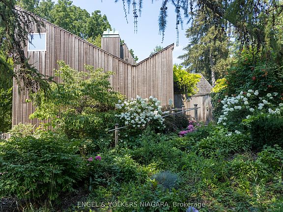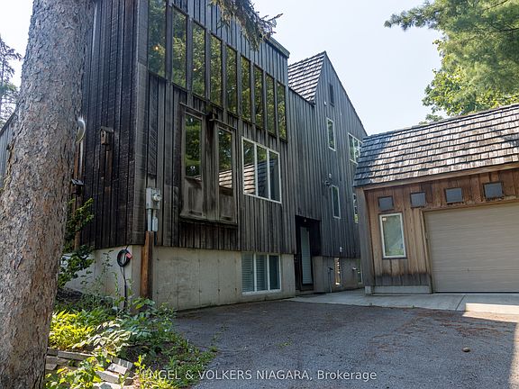 Custom built by artist Campbell Scott, this cedar clad house is totally unique. This is a Niagara on the Lake landmark building. Has been featured numerous magazines in North America and UK. Completly built of heavy west coast cedar and hardwood. House could be power washed to bring back the original golden colour of the cedar wood. Complete privacy. 2 fireplaces and 2 furnaces, all levels are finished. 650 sq' courtyard with fish pond and fountain are totally private. Soaring vaulted ceilings with ample natural light. A one of a kind home, with incredible workmanship. Walk to Old Town with its ample shops and restaurants. Lake Ontario is a short walk as well.