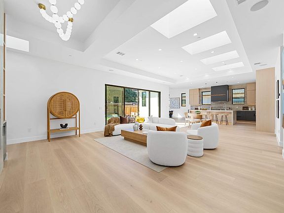 The thoughtfully designed open floor plan features 5 bedrooms, including 4 ensuite rooms, and showcases 7 skylights and large sliding glass doors that fill the home with warmth and sunshine. Premium finishes throughout include AB-grade white oak flooring, Marvin windows, 400amp panel, a full Thermador appliance suite, Bespoke cabinetry, and a spacious walk-in pantry. With 11-foot high ceilings, custom closets in every bedroom, and seamless indoor-outdoor flow, this home is ideal for both elegant entertaining and everyday comfort. Behind the scenes, no detail was spared, new gas line, whole-house insulation, integrated smart home features, and a water softener system ensure quality and convenience for years to come. Set toward the front of the lot, the property offers an expansive backyard ready for your dream outdoor lifestyle.whether its a pool, garden, or ADU. This residence not only provides modern luxury but also exceptional investment opportunity in one of Silicon Valleys most sought-after neighborhoods.