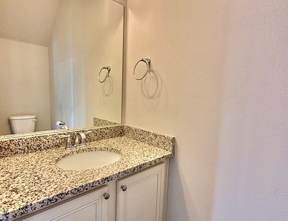 Upstairs, the spacious primary suite includes a large walk-in closet and a private bath with a double vanity and shower. Two additional bedrooms share a full hall bath, and the laundry room is conveniently located nearby. Other features include an attached garage, a guest half bath, stainless steel kitchen appliances, and granite countertops.