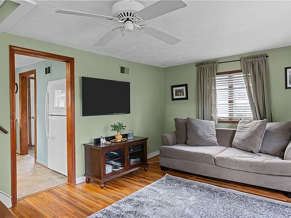The first floor features a spacious living room with a bay window, original hardwood floors, and a convenient layout with two bedrooms, a full bathroom, and first-floor laundry—ideal for single-level living. Upstairs includes a third bedroom plus a bonus room that can serve as a fourth bedroom, office, playroom, or additional storage space, giving the home great flexibility.