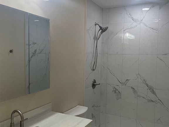 The bathroom features a walk-in shower and marble top vanity with soft close drawers and doors.