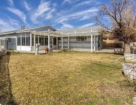 living room has bay window and an office to the side. large enough for a small bedroom. back patio from Master has solid cover and side patio has slatted shade cover. bonus sunroom behind garage.