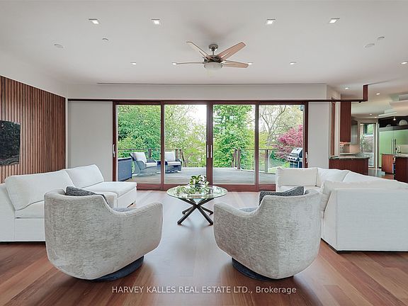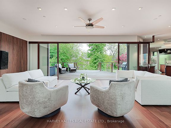 Discover a gem, custom-built as a multi-generational home, offering over 11,000 sq ft of luxurious living space on a rare 125ft double lot at the edge of the Humber Valley in the tree-lined Kingsway neighbourhood. This residence is a statement of contemporary elegance and sophistication, perfect for the discerning family.Inside, experience clean lines and exquisite details that enhance comfortable luxury living, including sound-isolated suites, Jatoba hardwood floors, stunning Persian serpentinite kitchen countertops, and heated stone floors for ultimate comfort.Accessibility is a key feature, with snow melt for the front porch, steps, ramp and driveway, a commercial 4x6 ft elevator, and 4 ft wide hallways to ensure effortless movement throughout the residence.The ground floor features a bright, open-plan living area that seamlessly integrates the chefs kitchen, dining, and living spaces, extending to a partially covered upper deck with a 17ft wide opening. A heated 3-car garage is cleverly positioned at the side of the house.The primary retreat is where luxury meets tranquility, featuring two generous walk-in closets and two ensuites one complete with a massage room and whirlpool tub offering tree-top views. Two additional spacious bedrooms, each with walk-in closets, share a thoughtfully designed bathroom suite with dual sinks, ample storage, and a separate area for added privacy. The oversized fourth bedroom also includes its own ensuite bathroom and walk-in closet, providing comfort and convenience for family or guests.The ground floor bedroom suite with a Juliet balcony offers a perfect retreat for guests.Venture to the finished lower level, where 10+ ft ceilings create a light and airy ambiance.This expansive space features a wide sliding door leading to the lower deck, ideal for entertaining.With multiple entertainment areas, including a stepped home theatre and sprawling park-like backyard, this home is designed for those who appreciate spacious comfort.