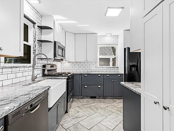 Renovated move in condition 3 Bedroom Cape offers 1.5 baths, easy care recent vinyl siding. Updates include new gas stove, electric water heater, paint, exterior doors, new carpet in main bedroom, Brazilian cherry hardwood fl in dining room. Updated Roof and windows, new interior staircase, basement windows and garage overhead door. Many beautiful extras including all tile or marble window sills! Beautiful recent tile shower (no tub). Lovely fireplace in front to back living room offers plenty of windows. Updated kitchen with granite counters, new gas stove and farmers sink. Good size primary bedroom offers new carpet, paint, 2 closets and lots of natural light from windows.2 additional bedrooms complete the upstairs. Terrific covered and outdoor deck space for entertaining looks out on private, flat back yard. Plenty of parking and one car garage.