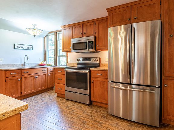 Incredible opportunity to own this classic antique-style home situated on 5 acres of picturesque land in convenient Hollis location! This home boasts an array of impressive features to cater to modern living, such as updated windows and roof, whole house generator, and a pellet stove. Remodeled kitchen has cherry cabinets, quartz counters, stainless steel appliances, and pantry. Versatile floor plan, including library with cathedral ceilings, separate family and living room, and enclosed porch. You will fall in love with the 3 story barn complete with 2 horse stalls, chicken coop, and plenty of room for animals, hobbies and toys! Parking won't be a problem with large driveway, 2 car detached garage with above storage, and even space in the lower level of the barn! Outdoor enthusiasts will enjoy this beautiful lot with a pasture, small frog pond, fenced in area for animals, and close proximity to the Hollis trail system. You don't want to miss this one of a kind property!