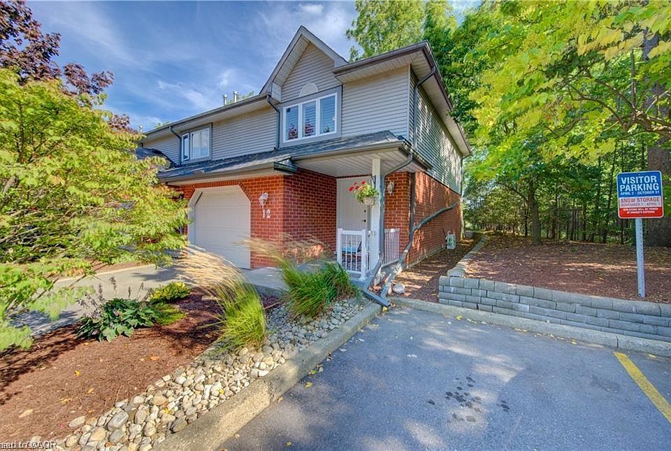 Welcome to Unit 12 at 89 Woolwich Street, Waterloo – a rare end-unit condo townhome that feels more like a semi, offering comfort, convenience, and excellent value. With 3 bedrooms and 2.5 baths, including the uncommon benefit of an ensuite bath at this price point, this home is ideal for families, professionals, or downsizers seeking both space and practicality. The main floor features a warm and inviting living and dining area with hardwood flooring, with the dining room offering a walk-out to a quiet patio overlooking trees and no rear neighbours. The location is complemented by the unbeatable convenience of nearby amenities, just minutes away from a grocery store, restaurants, a pharmacy, dentist, vet clinic, Tim Hortons, gas stations, and pet supply store. Upstairs, the spacious primary bedroom with ensuite is joined by two additional bedrooms with built-in fold-down desks, and another full bath. Elegant California shutters for privacy and light control, plus energy efficiency. The finished lower level adds even more possibilities, featuring a Rec Room, sauna, laundry area with a washer and dryer replaced in 2023, and a rough-in for a fourth bathroom. Practical updates and features include a garage with a 40-amp EV charger, an owned water softener, R.O. water filtration for the fridge, newer energy-efficient windows replaced within the past two years, and visitor parking for guests. Condo fees remain reasonable and cover lawn care and snow removal, including the unit’s driveway and walkway. This well-managed, family-friendly complex enjoys a prime location close to Bechtel Park’s trails, ball diamond, and dog park, with the scenic Grand River also nearby for canoeing, kayaking, and fishing. Public transit is easily accessible with several bus stops only a four-minute walk away. Quick access to the Expressway. Seller will credit the Buyer the equivalent of 6 months condo fees upon closing! Offers welcome anytime.