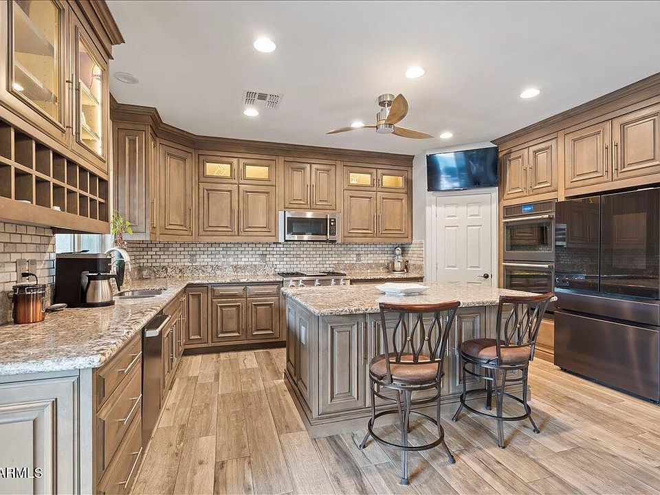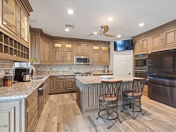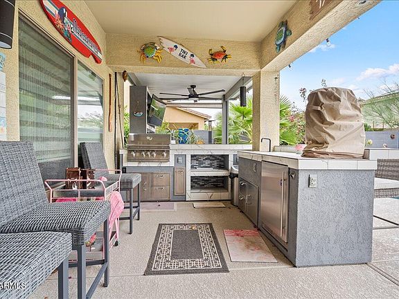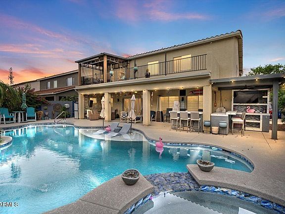 Resort living at home! This stunning 5-bedroom, 3,948 sqft San Tan Valley beauty has been transformed with over $200K in upgrades. Step inside to a custom-designed kitchen with rich cabinetry and granite counters, remodeled bathrooms, and a spacious loft. The primary suite opens to a full-length balcony for sunsets and mountain views. Outside is pure paradise: sparkling pool with Baja pad, hot tub, outdoor kitchen, and extended patio for year-round entertaining. With paid-off solar, Tesla battery backup, fresh turf landscaping, and a 3-car garage, this home is the perfect blend of style, function, and fun. Don't miss it!