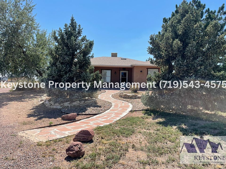 Welcome to this stunning property in Pueblo West, CO, nestled on a sprawling 1.75 acres at the base of the Front Range Mountains. This home boasts 3 spacious bedrooms, each equipped with ceiling fans and ample closet space, and 2 full bathrooms. The property also features a 1-car garage and a separate laundry room with washer/dryer hookups for your convenience. The kitchen is a chef's dream with plenty of cabinet and counter space, and comes with a refrigerator, stove, and dishwasher. This home has tile flooring throughout, allowing for personal decoration choices in each room. The property is equipped with a swamp cooler, septic tank system, electric gate to the driveway, solar panels that greatly reduce or eliminate your electric bill and a propane tank. The horse corrals with 2 stalls, barn and a tool/tackle shed, are ready for up to 2 horses with a deposit and rent. The property offers a high degree of privacy, making it a perfect sanctuary. Experience the perfect blend of comfort and convenience in this beautiful home.
