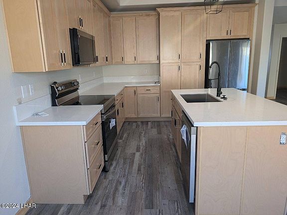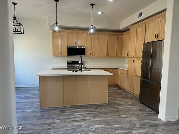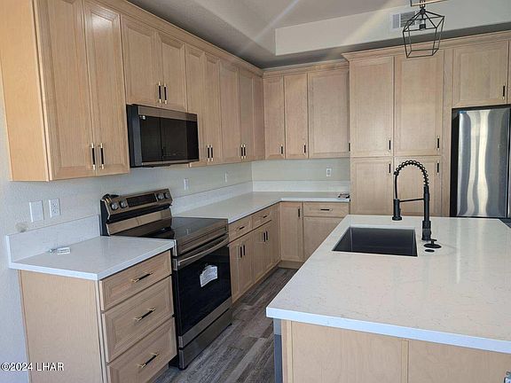 Luxurious condominium situated in a picturesque, gated community, boasting an array of amenities such as a swimming pool, spa, and BBQ area. This newly constructed unit adheres to the latest building codes, equipped with fire protection sprinklers and a four-layer synthetic stucco system. The lower-level residence comprises of two bedrooms, two bathrooms, and a well-designed split-open floor plan with numerous upgrades, complemented by a two-car attached garage. The kitchen is a highlight, upgraded appliances for optimal space efficiency, including a stainless-steel cooktop, built-in oven, refrigerator, dishwasher, and microwave. Custom-made soft-close cabinets, quartz countertops, and a generously designed master suite add to the overall appeal. The master suite includes a walk-in shower, dual vanity, and a spacious walk-in closet. Stylish lighting and color schemes enhance the ambiance throughout. Strategically located just minutes away from the Colorado River, Katherine Landing at Lake Mohave, restaurants, shopping centers, medical facilities, and the renowned Laughlin, Nevada casinos, this property offers both luxury and convenience.