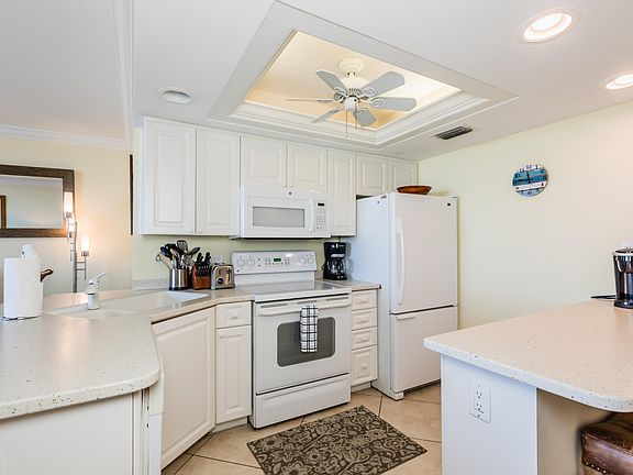 Beautiful front facing, end unit with gorgeous beach, gulf and sunset views. This unit is being offered turnkey furnished ready to enjoy or rent out. With opened kitchen, tile on the diagonal throughout and casual furnishings. Spacious bedrooms with king size bed in Primary bedroom and bunk beds and queen size bed in guest bedroom. Full 2 baths with updated glass shower/tub combo in both bathrooms. Washer and dryer in the unit. Avoid the elevator with this first floor unit with easy access to the pool and beautiful white, sandy beach. Close proximity to shopping, restaurants, mini golf and movie theatre. Weekly rentals allowed. Rental bookings solid through season with a professional agency.