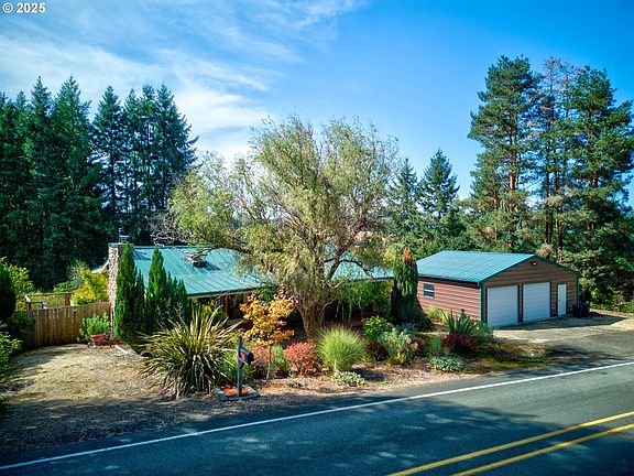 Welcome to 890 Vintage Dr, Elkton. A beautiful, quiet gardener’s delight on 5.35 gently sloping, cross-fenced acres. This charming log kit home features fire-resistant Hardie board siding and a durable metal roof. Inside, enjoy 3 bedrooms and 2 bathrooms with a welcoming open-concept floor plan, vaulted ceilings with skylights, and a warm pellet stove in the living room. The kitchen boasts stainless steel appliances, a pantry, and updated double-pane vinyl Pella windows throughout the home. The lower level offers a cozy woodstove, family room, and bonus room with sliding glass doors leading to a patio. Step outside to an amazing Fiberon composite covered deck with stunning views of rolling hills and valley. The property includes abundant fruit trees—apple, plum, pear—and plenty of garden space. Outbuildings include a 28x36 steel barn, 18x30 steel RV storage, chicken coop, potting shed, well house, and a detached 22x30 metal garage on a concrete foundation and slab. Fiber optic internet keeps you connected. Surrounded by small vineyards and near the Umpqua River, this home perfectly blends rustic charm with modern comfort.