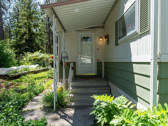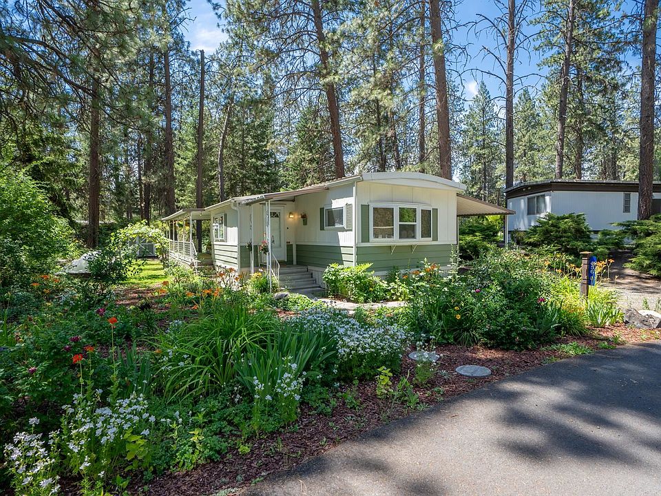 Tucked away in one of Spokane’s most peaceful communities, this beautifully updated 3-bedroom, 2-bath home is a gardener’s dream and a hidden gem. The property is located in Mullen Hill Terrace Park—just 8 miles from downtown—in an all-ages neighborhood with quiet, tree-lined streets and lush landscaping. This 952 sq ft home was fully remodeled in 2017 with new flooring, double-pane vinyl windows, and fresh blinds. Stay comfortable year-round with a new electric heat pump and A/C. The kitchen has also been refreshed with a sleek, modern sink and faucet. Step outside to a spacious 10x30 covered deck—perfect for relaxing or entertaining. The yard is bursting with native trees and flowers, plus grapes, a cherry tree, and raspberry/blueberry bushes. A shed, two-car carport, lawn mower, blower, and dehumidifiers are included. Water, septic, and park landscaping are covered in the lot rent. This home offers modern comfort, charm, and serenity in a quiet, nature-filled setting.