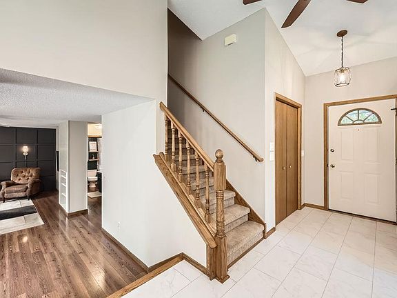 Unique 1-acre wooded lot two-story, 4bed/3bath home. New roof in 2024 and updated mechanicals. Inviting open foyer with vaulted ceiling flows into a functional kitchen featuring newer lighting, butcher block center island, and informal dining. The south-facing living room also flows into the kitchen, creating a spacious layout perfect for gatherings. Step down into a large family room with wood accent wall, built-in shelving, and walk-out access to the outdoor patio. This level includes an updated laundry room, half bath, and private den/office. Upstairs hosts 3 bedrooms, a full bath, and private ¾ ensuite in the spacious primary bedroom. The basement includes a 4th bedroom with egress window, multiple storage areas including a workbench, and easy mechanical access. Enjoy the outdoors with a brick patio, backyard firepit, swing set, garden, and shed with wooded views extending to the nature area across the street. This super clean original owner home is move-in ready and combines indoor comfort with outdoor charm!