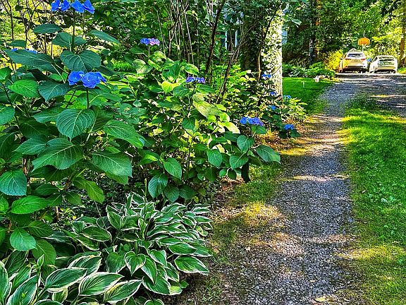 A beautifully long driveway leads you through the trees to your own sheltered cottage in the woods. Follow the sidewalk through lush perennials to the front door of this home offering so much more. Inside, you'll discover hardwood floors, a cozy wood burning fireplace, and a unique, deep-set picture window—perfect for sitting and enjoying nature through all the seasons. Toward the back of the house, there's a reading nook with built-in bookshelves. The heart of the home lies in the back, offering three-sided views of your beautiful backyard. The kitchen boasts classic white cabinets, hard surface countertops, and quality appliances. The kitchen island connects to the dining room, which provides easy access to the deck through sliding glass doors. The deck overlooks the almost-acre yard filled with azaleas, daffodils, dogwoods, forsythia, hydrangeas, hostas of all sorts, tulips and tiger lilies and rhododendrons. Additionally, you'll find a recently remodeled full bath, a bedroom, and an extra den/office/bedroom. Upstairs, there are two more bedrooms with ample storage space in multiple double closets. The primary bedroom includes a rare den/office with three-sided views of the yard. The lower level features a rec room with a custom picture window, a walkout to the backyard, another potential bedroom, and the utilities and laundry area.