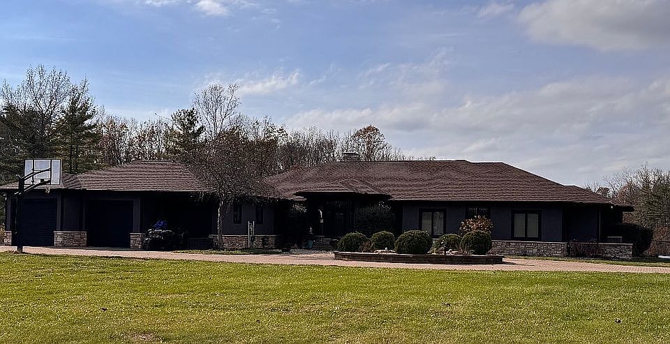 Serenity awaits in this exquisite home that combines luxury and privacy seamlessly. This stunning brick and stone ranch features a circular driveway, inviting inground pool, and two pole barns with a total of five bays—including a massive 40 x 68 space—set against 25 lush acres and a breathtaking lake. Step into the grand foyer with vaulted ceilings and detailed windows, leading to a formal living room adorned with a large two-way fireplace and elegant pillars. The spacious kitchen opens to a generous eating area, sitting room, and a large family room, offering awe-inspiring views at every turn. Each bedroom is generously sized with full bathrooms, and the master suite boasts a wall of windows and a roomy ensuite. Imagine waking up every morning immersed in this home's luxurious amenities. Outside, enjoy a climate-controlled garage with its own split unit, RV hookup, parking area, two docks, and a large fishing zone with a picnic area and fishing shed. There’s nearly an acre dedicated to a dog kennel with an insulated walk-in shelter, multiple hunting stands, and a private water launch with jet ski lifts. Relax around one of three fire pits or entertain on the elevated deck overlooking the fishing dock, water launch area, and scenic waters. There’s so much more to see—this home must be experienced in person. Explore all its features—size, acreage, outdoor amenities—against today’s market offerings. Nothing compares at this price. Additional photos available upon request after pre-approval letter.