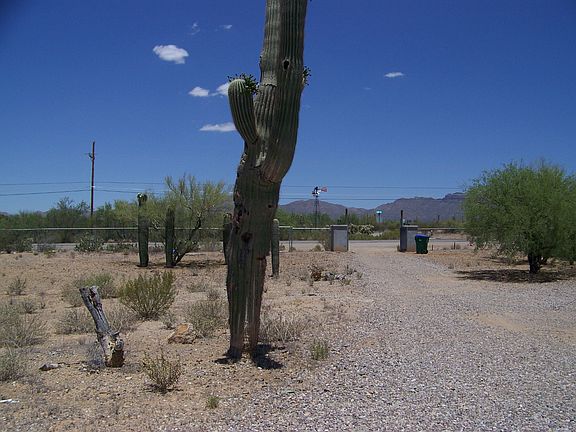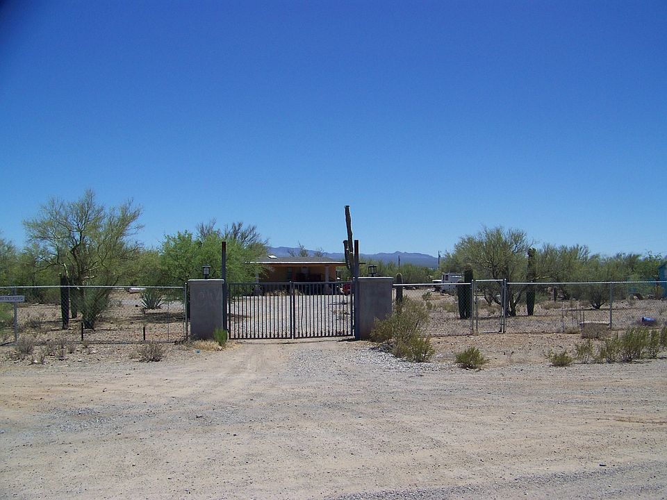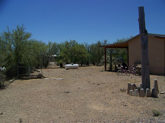 Super nice lot on paved Bopp Road w/MH. Just west of San Joaquin Rd. Almost an Acre, fully fenced w/front main gate, utilities and septic. Featuring two large porches, one north, one south that can be used as carports, or extra outdoor living space. Single wide MH has one bedroom & one bathroom. Plus a detached extra structure that can be a large workshop with covered patio, electricity and cooler (Currently used as a second bedroom). Great opportunity to own a piece of AZ with mountain views.