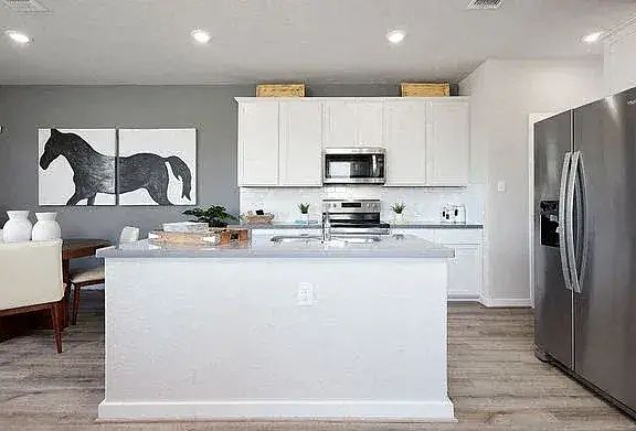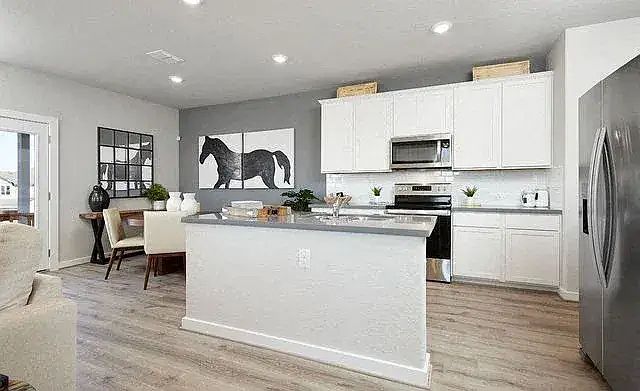 Open floor planHardwood floorsDining areaSmall covered patioLarge walk-in closetKitchen with islandLarge fenced-in backyard