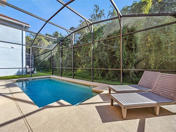 Under contract-accepting backup offers. Located in the guard-gated resort community of Paradise Palms, this 6-bedroom, 5-bath home offers 3,291 square feet of living space and comes fully furnished and turnkey. Built in 2012, the floor plan includes one bedroom on the first floor, with five additional bedrooms—including the primary suite—upstairs. A loft provides extra living space, ideal for a second lounge or game area. The home features a one-car garage and a private heated pool with no rear neighbor, backing onto a wooded area for added privacy. Its location within the community is excellent, just a short walk to the clubhouse and resort amenities. Paradise Palms is a guard-gated resort offering a wide range of amenities, including a large clubhouse with a theater room, arcade, fitness center, sundry shop, and bar and grill. Outdoor recreation includes a resort-style pool with two hot tubs, splash pad, basketball and tennis courts, beach volleyball, and a playground. The community is conveniently located just 3 miles from groceries, dining, and Sunset Walk, and 6 miles from Walt Disney World. Video and virtual tour available.
