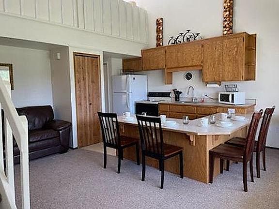 Fully furnished. 1 bedroom with queen size bed, a loft with queen size bed, twin bunks, and futon. It's a very spacious inviting unit with a beautiful view from the porch.