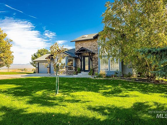 If your dream is to live in the country with wide open spaces, no HOAs and views for days...this property is for you! Five acres with plenty of room to park your toys, build a shop or bring your horses (includes barn structure that's ready for your personal touches). Three decks overlooking mature trees and a mini orchard are a place to relax and enjoy the peace and quiet of south Boise. This home features two masters, one on the main floor and one upstairs. The 3100 sq ft includes five bedrooms, three full bathrooms plus a powder room off the kitchen and an unfinished 200 sq ft room in the basement where laundry and utilities are housed. The walk-out basement provides lots of light and an easy exit, with the office being at the door to the outdoors. This home was custom designed/built by the current owner and has had recent updates including HVAC (NEW in July 2025) and roof replaced in 2018.