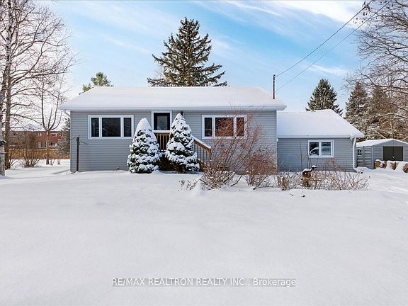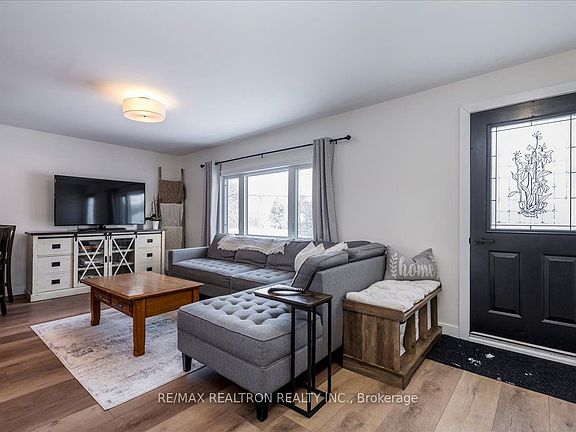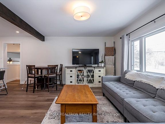 This charming bungalow sits on just over three-quarters of an acre at the edge of Angus and has been fully renovated with modern comfort and style in mind. Recent upgrades include a new heat pump, AC, and furnace installed in 2021 at a value of $20,000, as well as new siding, fascia, soffit, and eaves completed in 2025 and the roof is approximately eight years old. The home features new flooring throughout, a brand-new kitchen with quartz countertops and a subway-tile backsplash, and stainless-steel appliances including a propane stove. The open-concept main floor offers two spacious living areas filled with natural light, complemented by updated lighting, doors, and trim. The mostly finished basement provides additional living space with a dedicated man cave and a third bedroom. Outside, the property includes two sheds both with power, one with a newly installed roof, a gas barbeque line so you will never need to get propane. This beautifully updated home blends modern finishes with a generous lot, offering comfort, style, and room to grow.