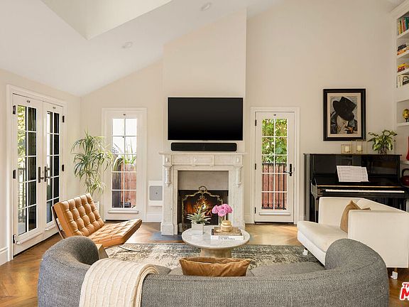 Rebuilt and reimagined to perfection, this rare single-level four bedroom residence embodies timeless elegance with soaring 15-foot ceilings, abundant natural light, and a seamless blend of classic craftsmanship and modern sophistication. Completed in 2023, every detail has been curated with the highest quality finishes and thoughtful design. Step inside to a luminous open floor plan featuring chevron white oak hardwood flooring, multiple skylights, custom millwork, and Forbes & Lomax designer light switches. The chef's kitchen is a true centerpiece with a dramatic 15-foot ceiling, Jenn-Air professional-grade appliances, dual appliance garages, pot filler, and an oversized island ideal for entertaining. The living room exudes character with original 1920s stained glass, a marble fireplace mantel imported from Europe, and built-in library shelving reaching to the ceiling. The primary suite offers vaulted ceilings, dual skylights, a gas fireplace, French doors with a Phantom screen system, and a custom walk-in closet. The spa-like primary bath showcases Bardiglio and Carrara marble floors, a clawfoot tub, oversized shower, and an antique door with a diamond-leaded window. Three additional bedrooms each with abundant storage and bespoke details share beautifully appointed bathrooms featuring Calacatta Viola marble and Phylrich fixtures. Outside, enjoy a serene private oasis with new hardscape and soft scape, diamond-pattern pavers, a motorized driveway gate, and lush privacy hedging. Additional features include Doorbird entry, EV charging, custom shed with power, and built in speakers throughout. Perfectly situated mid-block on one of West Hollywood West's most coveted streets, this home offers an unparalleled lifestyle steps from the city's best dining, shopping, and entertainment.
