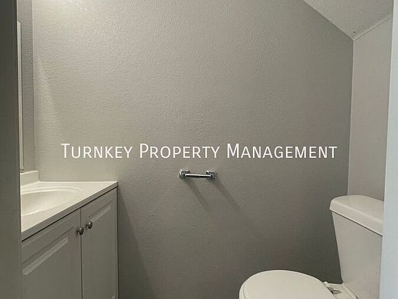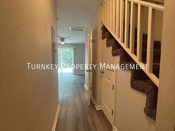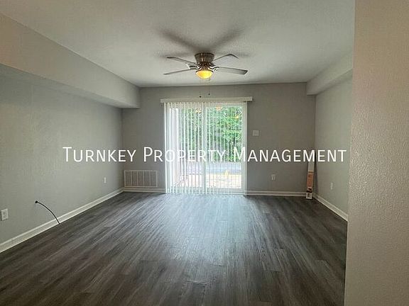 This Little Rock townhouse provides a thoughtfully designed two-story layout with a modern, inviting feel. The main living areas feature sleek grey wood-look flooring, while the bedrooms are finished with soft, plush carpet for added comfort. A ceiling fan and expansive sliding glass doors brighten the living room with abundant natural light.