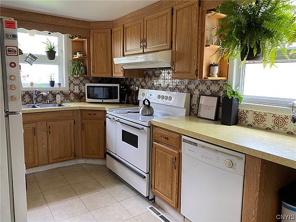 Welcome to this Weedsport Village home with all Village convenience, water, sewer, etc. but you will feel like you are in the country. Lot is 2 acres and is fully fenced with a dog kennel. Enjoy the updated covered patio on those hot summer days or relax in the air conditioned home. Seller has done numerous updates thru out the first floor. Entering thru the side door is a mud room with lots of storage. Totally renovated front porch with electric heater allowing you to use year round. Light and bright living room with hardwood floors and recently painted. Formal dining room with new flooring and fresh paint. Kitchen includes all appliances. Den has hardwood floors under carpet. Oversized garage interior has been finished, has a wood stove for heat, 2 ceiling fans and a wall air conditioning unit. and storage cabinets. Pulldown stairs to access the over head attic space. Easy commute to Syracuse or Rochester as the thruway is just minutes away. Located in the award winning Weedsport School District.