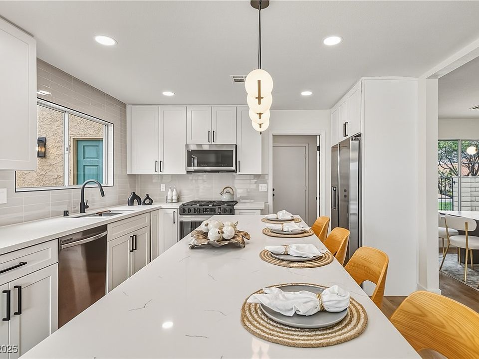Stunning modern home with a pool, no HOA in a prime location! This beautifully remodeled 3-bedroom, 2-bathroom home is move-in ready and packed with upgrades! Enjoy open-concept living with a spacious layout and designer touches throughout. The chef's kitchen features an 8-foot quartz island, sleek two-tone cabinets, and brand-new Samsung stainless steel appliances — perfect for entertaining or everyday living. Step outside to your own backyard oasis with a large private pool, fresh water-efficient landscaping, and a generous patio space ideal for gatherings. Additional highlights include modern light fixtures, luxury vinyl plank flooring throughout, fresh paint inside and out, wood-burning fireplace, two fully remodeled bathrooms. Located just minutes from Boca Park, Tivoli Village, Downtown Summerlin for top-rated shopping, dining, and parks — this home offers the perfect balance of style, comfort, and convenience. Don’t miss out on this rare opportunity!