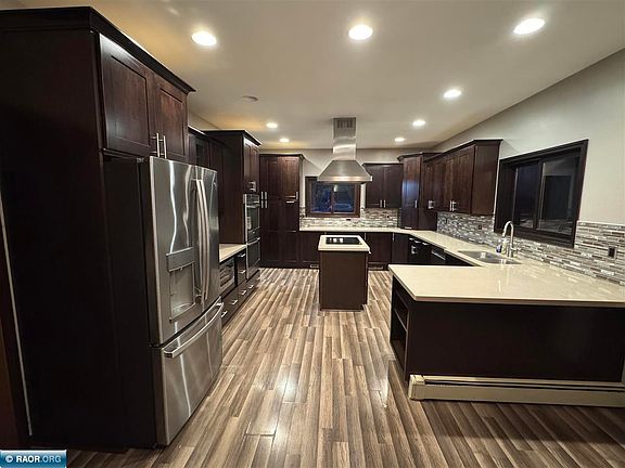 Two decks off homeCenter islandWood burning fireplaceCedar saunaTwo garagesStainless steel appliancesGlass tile back splash