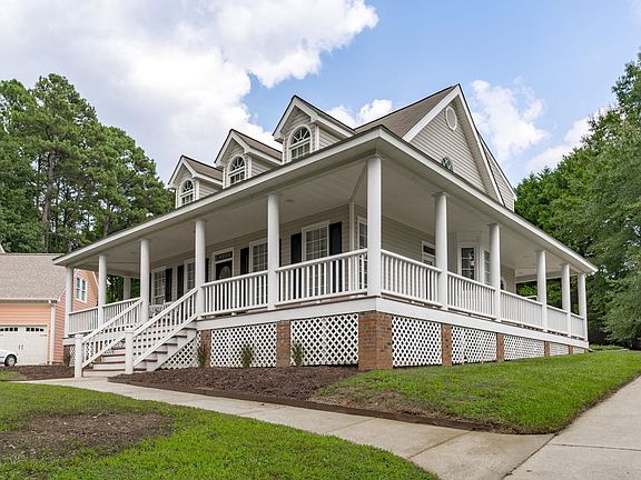 LOW COUNTRY feel in this CHARMING Home in Apex with a TRUE WRAP-AROUND PORCH ready to be decorated for the holidays! Special features include custom trim, new carpet, separate dinrm, 1ST FLOOR BDRM (Owners Bdrm) w/en-suite and huge walk-in closet. Upstairs has a second Owner's Suite w/ensuite and huge walk-in closet + add'l "bonus room size" 3rd bedroom. Detached, OVERSIZED garage has a second level - great for storage, crafts, workshop; plus a 3rd storage unit for your lawn tools. Private back yard allows for plenty of room for cookouts and entertaining. LOCATION is a plus! Walk to YMCA w/swimming, fitness, etc. Publix, Harris Teeter, coffee shops, restaurants, shopping 2 miles away. The new Rt. 540 only 1.5 miles away for easy access to Raleigh, RDU. This charming home is Move-In Ready!