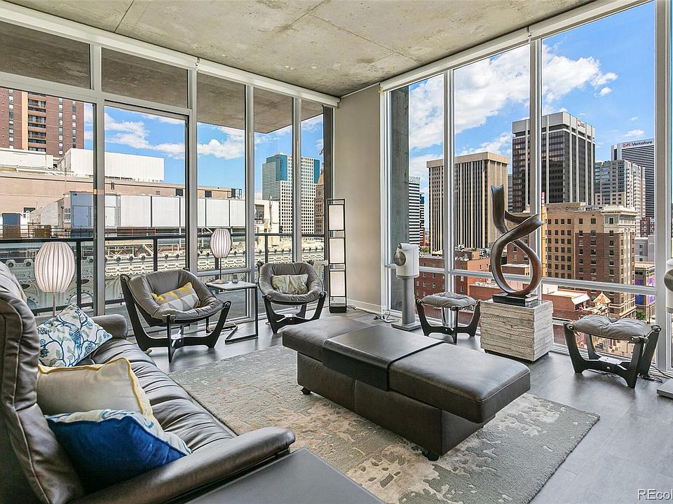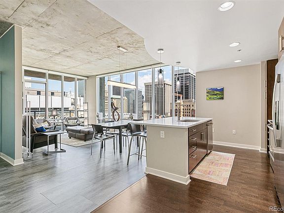 CORNER UNIT is situated on the 14th floor and has stunning views of Downtown Denver and the Rocky Mountains. Floor-to-ceiling windows provide cheerful, natural light & the private corner balcony, one of the largest in the SPIRE, allows an unobstructed view of the city’s lively energy below. The open-concept floor plan with soaring ceilings offers flexibility for entertaining, relaxing & working. The kitchen boasts stainless-steel appliances, custom tile work, modern pendant lights, quartz counters & island that seats 4. Dining area features a new modern chandelier & can fit a table that seats 6. Living room has two walls of glass to the city views & opens to the large balcony. Primary bedroom features views of the mountains & the city & has an en-suite bath with granite vanity, new toilet, glass enclosed shower, tub & walk-in closet. The 2nd bedroom offers a view of downtown Denver, is tucked away from the living area & has new ceiling fan light. The guest bath has granite vanity & tub. Convenient in-unit laundry has washer & dryer. Built-in desk with quartz counter is perfect for working from home. More features: Motorized blinds at all windows, frosted glass doors, coat closet, ceiling fans, wood flooring, luxury vinyl flooring, tile & carpet. Enjoy 1 parking space in attached garage & 1 storage unit. SPIRE is a LEED-certified building with over 40,000 square feet of fantastic amenities with mountain & city views; year-round heated pools, hot tub, fire pit, grilling area, health club, work space, multimedia theater & event lounge. Benefit from 24-hour courtesy desk services, security & access control systems & guest suites. Bundled utilities include 1-gig Internet, DirectTV & more. Your dog will love the dedicated dog park. Located in the heart of Denver’s LoDo neighborhood & is a few steps from Performing Arts-DCPA, Convention Center, Light Rail, 16th Street, Ball Arena & Larimer Street. Embrace the fun downtown lifestyle & make this SPIRE residence your own!