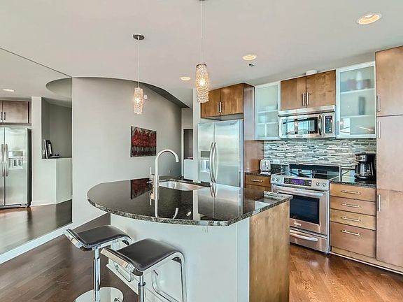 1 bed, 1 bath condo at 891 14th St Unit 4212. This unfurnished home is located on the 42nd floor and offers impressive city and mountain views through floor-to-ceiling windows. The open layout includes hardwood floors, stainless steel appliances, modern finishes, and in-unit laundry.