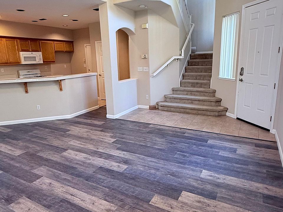 Step inside to a bright and airy open-concept living space, where soaring vaulted ceilings and abundant natural light create an inviting atmosphere. The downstairs seamlessly combines the kitchen, dining, and family areas into one expansive space perfect for entertaining or relaxing with loved ones. New luxury vinyl installed throughout living and dining area.