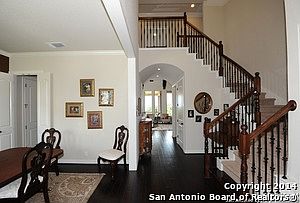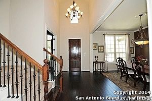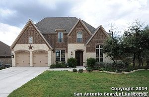 STUNNING on 1/3 acre (TREED SINGLE FAM LOTS BEHIND)--5 bedrooms with Huge Master + Guest Br down & all the amenities you expect. Open plan with terrific flow features *Great Island Kit* w/miles of granite counters, BEAMED cathedral ceiling in fm rm w/corner fp, butler's pantry, study, formal dining, lots of tile and wood, 4 full + 2 half baths, huge game rm w/wet bar, media room, great view off massive outdoor living (w/gas line), 3 car (stacked) gar, fence, spklr, water softnr & much more! BOERNE ISD!!