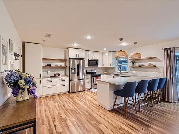 Welcome to your dream home! This 3-bedroom, 2-bathroom gem is move-in ready and awaiting its new owners. Located in the Quail Creek Neighborhood in North Central Austin, it's hard to find a more convenient location. This home features an open-concept kitchen/dining/living area. The kitchen is recently updated, featuring a large peninsula with solid surface countertops, ample cabinet storage, and stainless steel appliances. Both the hall bathroom and the en-suite bath located in the primary bedroom are updated with modern tile and fixtures. The primary bedroom has a large walk-in closet with custom built-in organization plus automated room darkening blinds for a good night's sleep! This home has been updated to durable luxury vinyl plank throughout. The expansive backyard delivers a serene private oasis. The covered patio (with string lights and ceiling fans) provides the perfect setting for al fresco dining or simply unwinding after a long day. The 2-car garage has a car charger already installed so bring your EV with no hassle. Austin FC Stadium and the Domain are a short distance away giving you easy access to entertainment, restaurants, and shopping.