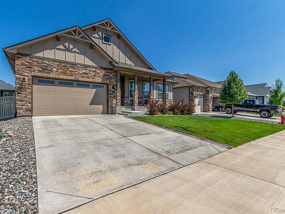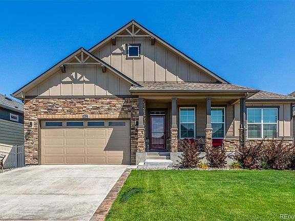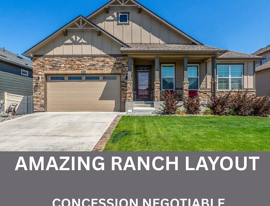Desirable Ranch floor plan. This gorgeous 3 bed, 2 bath with office residence in Falcon Point at Saddleback is the one for you! Featuring a charming facade w/stone accents, a lush green front yard, a 2 car garage, and a welcoming front porch entry. Discover a spacious layout with high ceilings, popular LVP luxury vinyl plank flooring, upgraded lighting, large open spaces. This homes layout is perfect with the primary suite on the east side and the two additional bedrooms on the west side of the home. The great room w/high ceilings, ample windows, crisp palette, and a fireplace to keep you warm & cozy on cool Colorado nights. The kitchen is a dream with white shaker cabinetry, a pantry, granite counters, subway tile backsplash, pendant lighting, stainless steel appliances, and a huge granite island complete w/a breakfast bar seating. A cozy dining area off the kitchen has easy access to the covered patio. End your busy day in the primary suite, showcasing soft carpet, spacious layout with a private bath w/dual sinks, large walk in shower with bench seat, and two closets one of which is a walk-in closet for all your belongings. Don't forget about the office or den w/elegant French doors. There are two additional bedrooms and another full bath. The laundry room is perfect with utility sink and added storage. The best part is the covered patio, with TV mount and ample space for a great relaxation space. The mature backyard has an artificial turf lawn, no mowing. This home is a true gem!