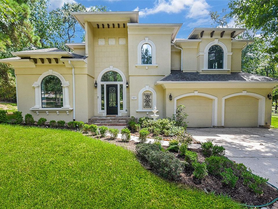 Nestled on a serene 1.2-acre lot with lush mature trees & abundant wildlife, this stunning Mediterranean house features an inviting front yard & an elegant iron door. The living room captivates with a dramatic two-story ceiling, refined trims, & custom-built entertainment center, seamlessly connecting to the brand-new kitchen & breakfast area with picturesque bay windows. Fully remodeled, it boasts top-quality appliances, granite countertops, & updated fixtures, complemented by sleek porcelain tiles & engineered hardwood floors. The luxurious master suite features tray ceiling, exquisitely tiled bathroom, walk-in shower, soaking tub, dual vanities, & two expansive walk-in closets. Upstairs, spacious living area, two bedrooms with shared jack-and-jill bathroom, & private bedroom with its own en-suite bathroom. The vast back patio offers tranquil retreat among the trees, overlooking the sprawling backyard. Ideal for those seeking a blend of modern comforts & the serene beauty of nature.