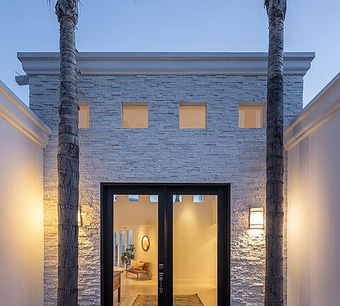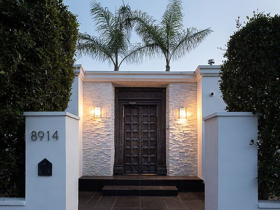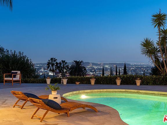 Welcome to this opulent Hollywood-inspired gem set behind lush privacy hedges and perched above the Sunset Strip with sweeping, sit-down views of the city beyond. A dark stone path leads to an important, commanding wooden door of intricate, ornate detail flanked by textured white stone. Two perfectly placed palms stand tall in the distance, framing the approach. Through the doors, a private courtyard beckons you to enter into the home through two glass-paned doors. The pristine foyer is carefully appointed with square clerestory windows that line the perimeter of the space and bathe the area in natural light. The formal living room is centered by a welcoming fireplace and multiple sets of French doors to the outside. Both the dining room and kitchen feature a skylight above, and the kitchen offers an array of glossy white cabinets, center island with bar seating, eat-in area, and top-of-the-line stainless-steel appliances including Viking cooktop with hood. The spacious primary suite includes French doors to the rear patio, walk-in closet with storage, and bathroom with separate shower, free-standing tub, and toilet room. Outdoor spaces can also be accessed from secondary bedrooms and office. Lounge by the kidney-shaped pool, dine under the stars, or take in the vast twinkling views from your refuge above the city. Enjoy a prime location above the famed Sunset Strip with access to countless shops, fine restaurants, buzzing nightlife, and all of the entertainment the area has to offer.
