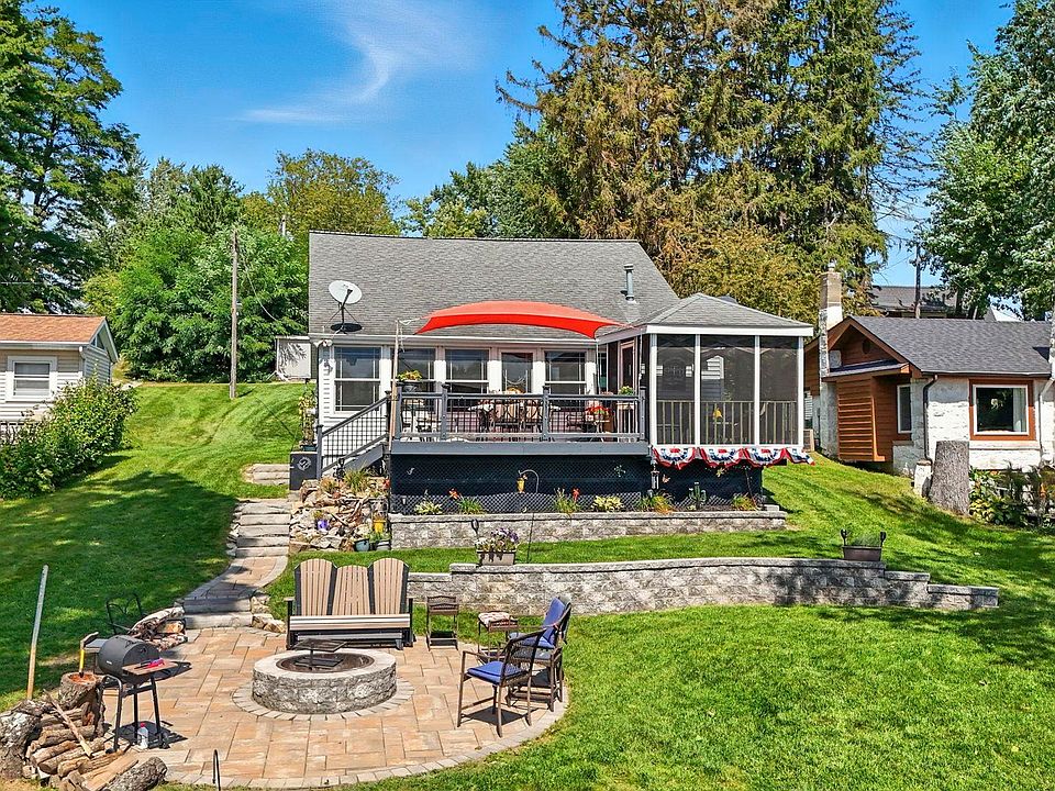Open House Sunday Oct 5th 1-3pm. Beautifully updated 3-bedroom, 1-bath lakefront home offering 50 feet of frontage on Lake Papakeechie—a no-motor lake that ensures a quiet, serene environment with excellent swimming, floating, fishing or ice fishing. This 1,240 sq ft retreat features stunning lake views, a terraced lawn created with attractive retaining walls, that provides a level front (lake side) yard, a recently built 15 ft flagstone patio with firepit, and a large deck with a covered screen room, all perfect for enjoying everything the great outdoors has to offer. Inside, you'll find a remodeled kitchen with quartz countertops, a remodeled bathroom with a custom tile shower, newer windows on the lakeside, new LVP flooring on the main level, and an inviting living space with a gas fireplace and central air. The property includes a finished mancave shed with power and AC, ideal for hobbies, guests or relaxation, as well as two additional storage sheds (20x10 and 8x8) for all your tools and toys. Located less than half a mile from Lake Wawasee Family Fishing Area, which features three public fishing piers and a shaded picnic area, plus a public boat ramp for easy Wawasee recreation lake access. Nearby attractions include the Wawasee Area Conservancy Foundation nature trails, South Shore Golf Club, Man Cave Brewing Company, The Channel Marker seafood restaurant, and Ye Old Tackle Box for fishing supplies. Grocery, retail and restaurant options are just minutes away. This home offers a rare combination of tranquility, charm, and convenience.