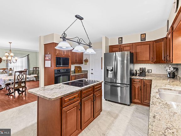 Fantastic brick-front Colonial with side-load two-car garage and beautifully landscaped grounds, showcasing pride of ownership throughout. The renovated island kitchen is a showstopper—featuring upgraded granite countertops, high-end cabinetry with under-cabinet lighting, designer glass tile backsplash, pantry, and updated stainless-steel appliances (no built-in desk for a cleaner, open look). The kitchen opens to a bright breakfast nook with bay window and decorative columns leading to the inviting family room, which offers hardwood floors, ceiling fan, skylight, and a charming brick wood-burning fireplace with oak mantle. Enter through a two-story foyer with turned staircase, decorative ledge, and transom windows with sidelights. Formal living and dining rooms feature crown molding and hardwood floors, with a chandelier accenting the dining area. The updated half bath includes a designer vanity, mirror, and lighting. The laundry room features full-size front-load washer and dryer, cabinetry, and a laundry chute. Upstairs, a catwalk overlooks the foyer and family room. The spacious owner’s suite includes crown molding, ceiling fan, wall sconces, and a large walk-in closet, plus a Bluetooth stereo speaker system in the luxurious RENOVATED bath with dual granite vanities, pedestal tub, and a stunning walk-in shower with multi-body sprays, rainfall head, glass enclosure, bench seating, skylight, and built-in TV niche. Three additional bedrooms include ceiling fans, and the hall bath is also RENOVATED. The finished basement offers a large recreation room, recessed lighting, ceiling fans, half bath, a versatile office/gym/media room, workshop with built-ins, and side exit. Outdoor living features a full-length rear deck overlooking a wooded backyard with a screened, self-watering raised garden, two sheds, and gazebo. Additional highlights include 2x6 exterior walls with added insulation, two main electrical panels totaling 350 amps, central vacuum system, solar panels, dual-zone HVAC, eight-zone sprinkler system, updated windows, 2023 HVAC and water heater, garage with designer tile floor and lighting, and full security camera system. This exceptional home blends elegance, comfort, and energy efficiency in a peaceful wooded setting.