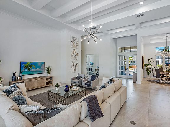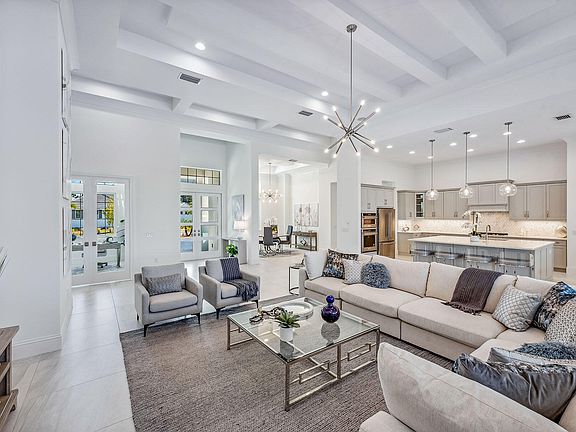 A newly built masterpiece situated on a quiet cul-de-sac street in the new exclusive gated community of the prestigious Isles of Collier Preserve. This exquisite property offers 3,578 square feet of sophisticated living space, comprising four bedrooms, a den and 4.5-baths. As you approach, the wide paver driveway gracefully leads you to a three-car garage with epoxy flooring, setting the stage for the home's striking tile roof with metal accents, and impact-resistant doors and windows. The lush preserve and mangrove backdrop with southwestern views is ideally framed by an expansive picture window screen enclosure. This outdoor oasis features a gas-heated saltwater pool and spa, covered area with coffered ceiling, a built-in gas fireplace and an outdoor kitchen with gas grill, granite countertops, and a large center island for endless relaxation and entertainment while enjoying stunning sunsets. Inside, the awe-inspiring 14-foot ceilings, adorned with crown molding, smooth coat walls and ceilings, recessed lighting, open floor plan and in-ceiling speakers amplify the grandeur. The foyer welcomes with museum-style double glass doors, while the den with its tray ceiling and glass French doors offers a tranquil retreat. The living room with pocketing 10-foot sliders that join the inside with the outdoors, is accentuated by a stunning beamed ceiling with a designer chandelier, seamlessly flowing into the gourmet kitchen. Here, pristine shaker-style cabinets with underlighting, quartz countertops, Carrara marble backsplash, grand center island, walk-in pantry, and new KitchenAid appliances, including a five-burner gas cooktop, await culinary exploration, together with the breakfast area overlooking the pool. The formal dining room, with its coffered ceiling, basks in natural light, setting a picturesque scene for gatherings. The owner's suite features pool views, tray volume ceiling, two walk-in closets, private lanai access, and a spa-like en-suite bath with dual sinks, framed mirrors and large walk-in shower. All three guest bedrooms are en suite with private baths for each room and on the opposite side of the home as the primary for privacy. Additional highlights include designer lighting, two Trane HVACs, instant hot water and a 500-gallon propane tank. Oversized laundry room with plenty of storage and counter space, and sink. Enjoy a new Stock-built Marigold floor plan home with high-quality features but without dealing with the hassles of the building and punch-out process. The Isles of Collier Preserve residents enjoy a gated entrance, resort-style and lap pools with cabanas, clubhouse, restaurant, fitness and wellness center, sauna, dining, dock with kayak launch, and courts for tennis, pickleball and bocce. Just 10 minutes from downtown Naples, this home is a gateway to a lifestyle of unparalleled luxury.