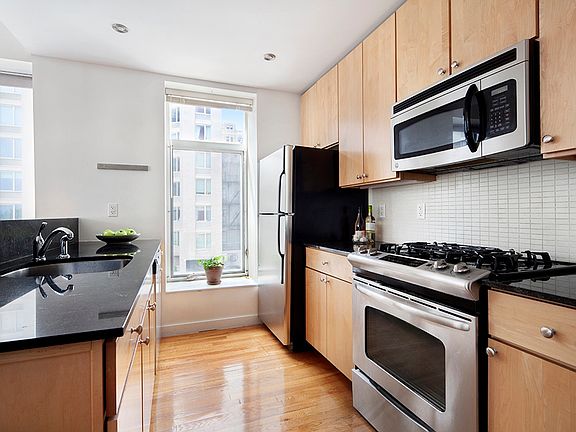 This spacious corner one-bedroom home features a welcoming open layout with large windows on both its southern and eastern exposures. The open windowed kitchen has exceptional granite counter space, stainless steel appliances and a dishwasher. A private balcony adjoins the living room, while the large bedroom boasts floor-to-ceiling windows and amazing closet space. There is also a convenient in-unit washer/dryer.