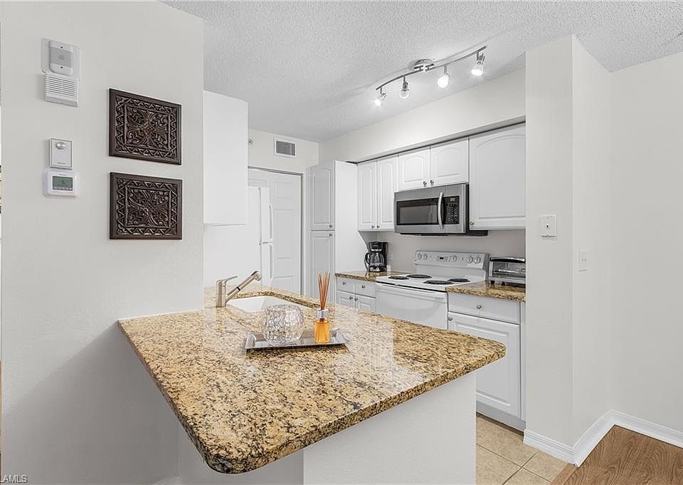 Located in the highly desirable gated community of San Mirage, this turnkey furnished 1-bedroom, 1-bath condo is situated on the top floor of a 2-story building, offering added privacy and a peaceful interior landscaped view. The bright, south-facing unit is tastefully updated and move-in ready—perfect for seasonal, rental, or full-time use. San Mirage is known for its strong financials, with over $1 million in reserves, and has undergone significant community improvements in recent years, including new roofs, fresh exterior paint, a resurfaced pool deck, and an updated gated entry. The community is pet-friendly (2 dogs up to 40 lbs allowed) and offers amenities such as a resort-style pool and spa with cabanas, fitness center, car wash station, bike storage, and social events. Low HOA fees include water and basic cable. Ideally located just 4 miles to Bonita Beach, 0.5 miles to Downtown Bonita Springs, and convenient to Riverside Park, the Promenade, Sugarshack, and RSW Airport—this unit is a fantastic opportunity in a well-managed and welcoming community.