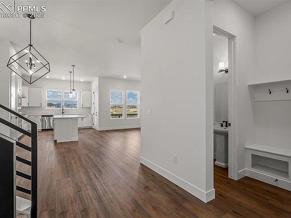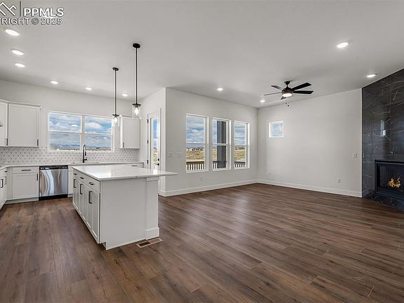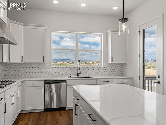 Embrace a low-maintenance lifestyle with this beautifully designed new construction home in the desirable Revel Crossing community of Wolf Ranch. Nestled on a premium homesite, this home offers the perfect blend of elegance and functionality, making it an ideal space for social gatherings, family moments, and future memories.    With a 3-car tandem garage, a xeriscaped yard for easy upkeep, and a spacious rear deck that showcases breathtaking views of Pikes Peak and the Front Range, this home is a paradise for outdoor enthusiasts.    Step inside to discover designer-appointed finishes throughout, starting with the gourmet kitchen. Equipped with a built-in microwave and oven, a large oversized island, upgraded GE appliances, sleek white cabinetry, unique quartz countertops, and a striking tiled backsplash, this kitchen is perfect for creating new culinary masterpieces to share with friends and family. The adjacent dining room offers a welcoming space for intimate family dinners or casual meals.    The expansive family room is flooded with natural light from large windows that frame the stunning mountain views, while the cozy fireplace creates the perfect ambiance for relaxation.    For additional living and entertainment space, the walkout basement provides a guest bedroom, a full bathroom, and room for more recreational activities.    Upstairs, the Owner’s Retreat is a serene sanctuary with a luxurious Super Shower in the private bath and a generous walk-in closet. Three additional secondary bedrooms and two full bathrooms provide plenty of space for family and guests.